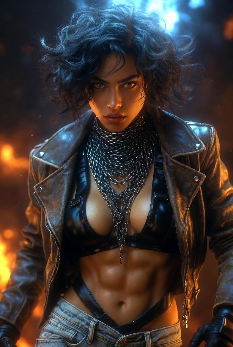 She is clad in a meticulously detailed, open brown leather biker jacket, showcasing realistic material imperfections like fine creases, subtle scuffs, and visible stitching, rendered with PBR accuracy and anisotropic reflections. Beneath, a taut, glossy black synthetic top accentuates her powerful physique and sculptural anatomy, with metallic zippers and seams. Multiple layers of heavy, interconnected silver and dark metallic chains adorn her neck, each link intricately detailed with varying reflectivity, adding an element of urban grit. Her incredibly well-defined abdominal muscles are prominently displayed, highlighting a strong, athletic build. She wears perfectly textured, light blue distressed denim jeans, slightly unbuttoned and partially revealing black harness straps, complemented by sleek black tactical gloves.
