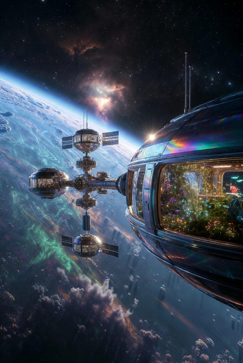 A serene cosmic landscape featuring a highly advanced, iridescent space station orbiting a vibrant exoplanet, bathed in the glow of a distant nebula. The station should have intricate energy conduits and a bioluminescent flora garden visible through panoramic windows.