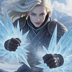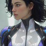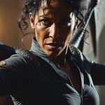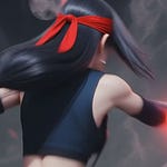 Lady Deadpool in a form-fitting red and black suit, with a full mask, a long red ponytail flowing from behind her head, and two katanas strapped to her back. She stands on a bridge with yellow road markings, arms raised with hands clasped behind her head, looking back over her right shoulder. A detailed utility belt with pouches and a Deadpool logo buckle is visible around her waist. The background features a blurred cityscape under a bright sky. Realistic, dynamic pose, Marvel character.
