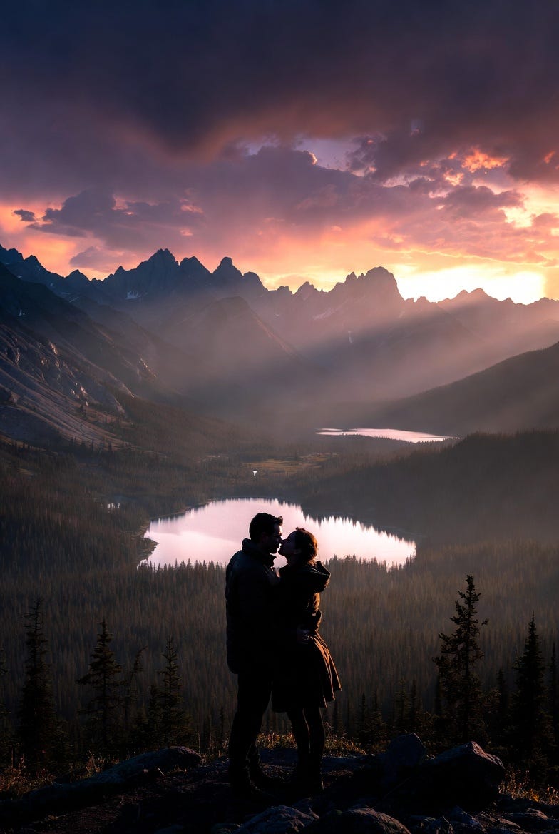 Generate a photorealistic, ultra-high-definition panoramic image capturing a tender moment between a husband and wife. The couple, silhouetted against a dramatic sunset, are sharing a gentle kiss atop the Opabin Plateau in the Canadian Rockies. The scene should emphasize the vastness and grandeur of the mountainous landscape, with jagged peaks, pristine alpine lakes, and dense evergreen forests stretching into the distance. Golden hour lighting, rim light on the couple, dramatic sky with hues of orange, purple, and deep blue. Shot on a Sony Alpha a7R IV with a GM 24-70mm lens, f/2.8, ISO 100, 1/250s. Cinematic, epic scale, breathtaking detail, crisp focus, emotional depth, vibrant color grading, slight lens flare, depth of field.